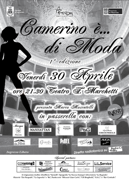 Una serata all’insegna della moda a Teatro Filippo Marchetti venerdì 30 aprile dalle ore 21,30 per la prima edizione di “Camerino è…di moda” serata di gala organizzata dall’associazione Art.com in collaborazione con il Comune di Camerino e la Provincia di Macerata.
