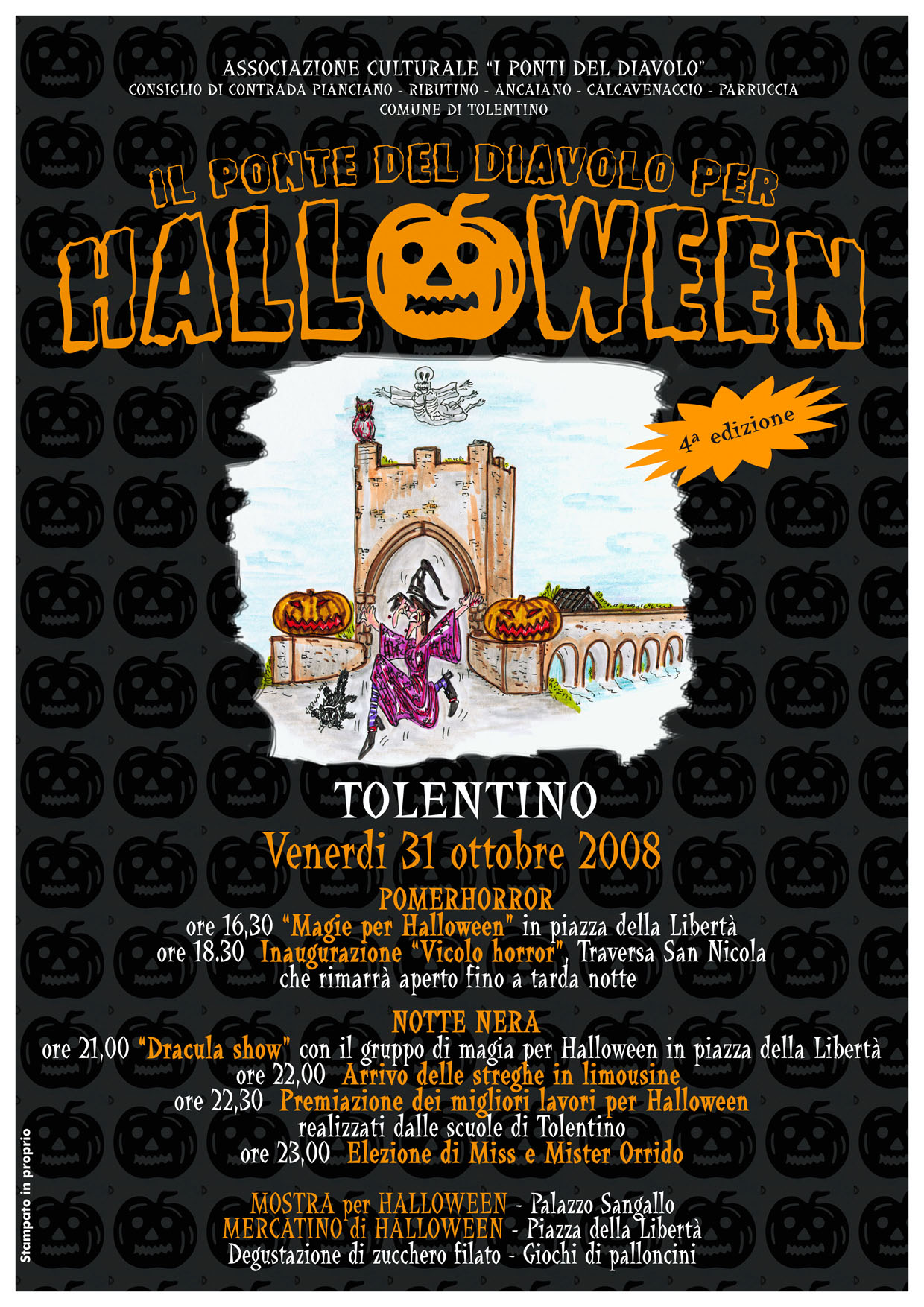 Ore 21.00: "Dracula show" con il gruppo di Magia per Halloween c/o Piazza della Libertà; Ore 22.00: Arrivo delle Streghe in limousine; Ore 22.30: Premiazione dei migliori lavori per Halloween realizzati dalle scuole di Tolentino; Ore 23.00: Elezione di Miss e Mister Orrido.