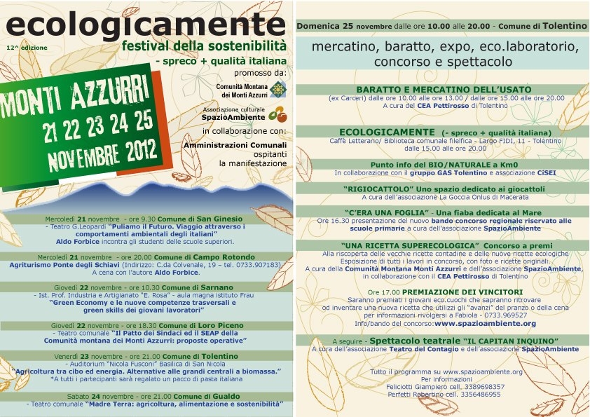 Dopo il successo di “Ecopolis”, partirà il 21 Novembre 2012 “Ecologicamente” il Festival della Sostenibilità promosso dalla Comunità Montana dei Monti Azzurri e dall’Associazione culturale Spazio Ambiente in collaborazione con le amministrazioni comunali di San Ginesio, Camporotondo di Fiastrone, Sarnano, Loro Piceno, Tolentino e Gualdo che faranno anche da palcoscenici al Festival, fino al 24 Novembre.