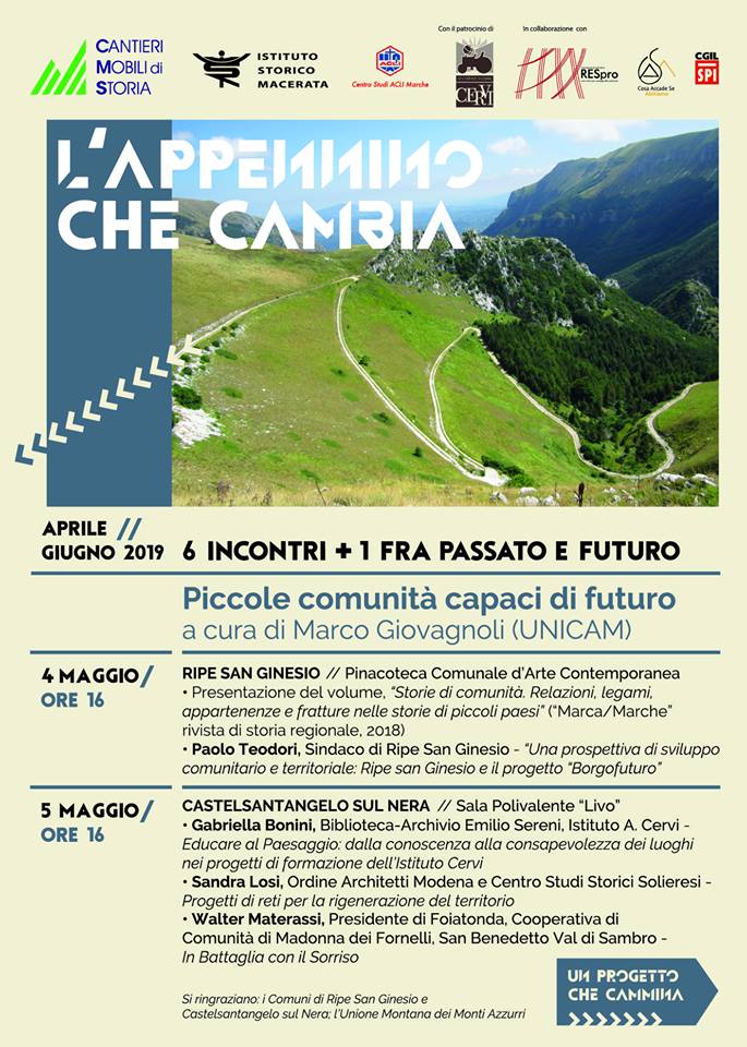 I cantieri mobili di storia (cicli di incontri per ricordare il passato e ritrovare il futuro) del 2019 sono incentrati sul tema "PICCOLE COMUNITA' CAPACI DI FARE FUTURO" e saranno condotti da Marco Giovagnoli, docente di Sociologia dei Processi Economici e del Lavoro presso l'Università degli Studi di Camerino.