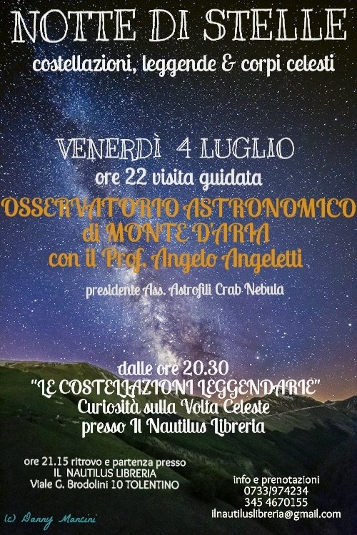 Dove: da ore 20.30 ad ore 21.10 c/o Libreria "IL NAUTILUS" (Viale Giacomo Brodolini 10) a TOLENTINO (MC) - ore 21.15 partenza per l'osservatorio astronomico di Monte d'aria a SERRAPETRONA (MC)